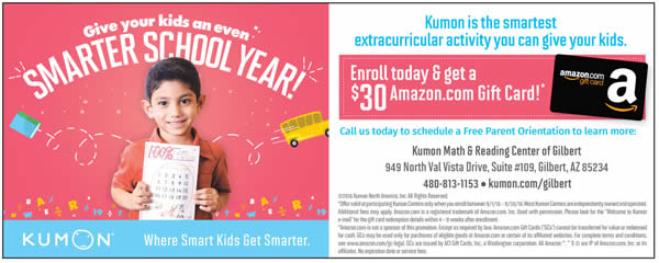 At Kumon, our math and reading programs help children of all ages and levels become eager, independent self-learners. Unlike tutoring sessions, Kumon helps children learn how to learn on their own, and develops strong academic skills. Our students gain a sense of confidence that will help them in the classroom and beyond. Please call (480) 813-1153, visit our website, email, or stop by to schedule your free placement test.